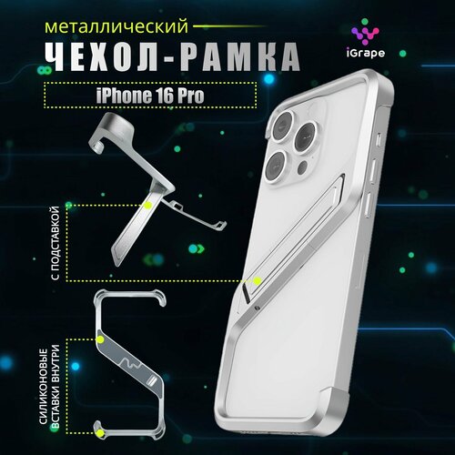 Металлический чехол-рамка с подставкой для iPhone 16 Pro, iGrape (Серебристый) / чехол на айфон 16 про