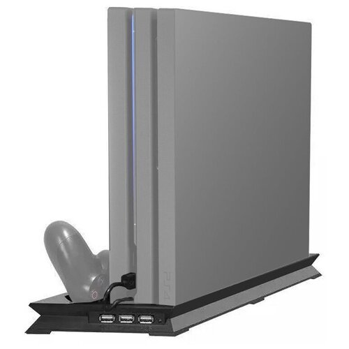 Стенд (подставка) для вертикальной установки консоли PS4 Slim + охлаждение + зарядная станция для 2-х геймпадов, USBx3, черная