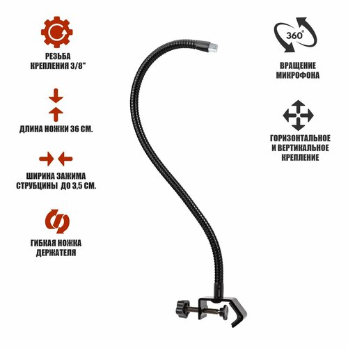 Гибкий держатель 36 см с зажимом на штатив, резьба 3/8, для крепления микрофона