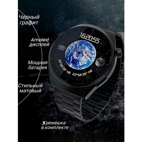 Смарт часы мужские, умные часы наручные электронные, металлический браслет для часов, 3 вида ремешка, беспроводная зарядка, bluetooth, круглые, черный графит