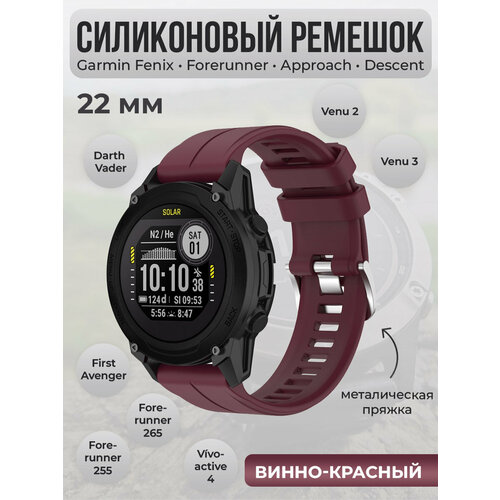 Силиконовый ремешок для Garmin Fenix / Forerunner / Approach / Descent, 22 мм, cеребристая пряжка, винно-красный
