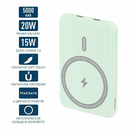 Внешний аккумулятор OLMIO QM-06, 5000mAh с магнитной беспроводной зарядкой 15W, MagSafe, салатовый