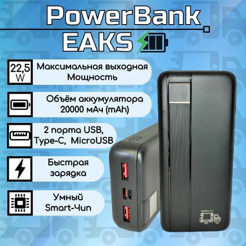Внешний аккумулятор power bank 20000 mAh быстрая зарядка 3 выхода QC 3.0 22,5W usb type c micro