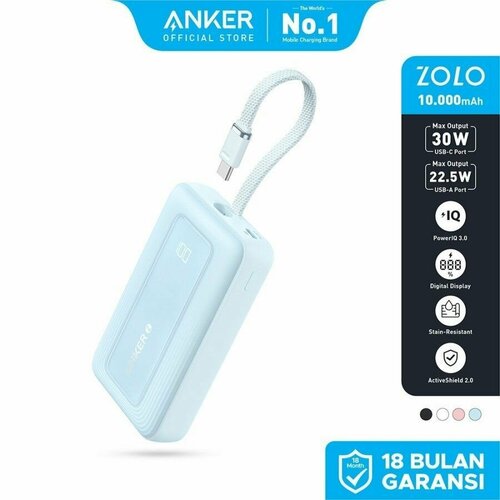 Высокоскоростное портативное зарядное устройство Anker Zolo 10000mAh, 30W (with cable Type-C) - Blue