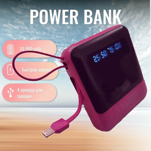 Внешний аккумулятор портативный повербанк портативная зарядка с проводами мощный 10000 мАч, красный (powerbank)