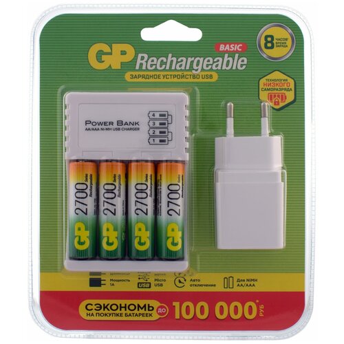Универсальное зарядное устройство GP с USB для аккумуляторов GP и 4 шт. АКБ 2700 мАч (АА) + провод micro USB