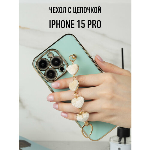 Глянцевый силиконовый чехол на iPhone 15 Pro с цепочкой из сердечек