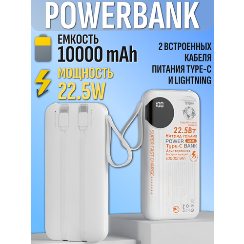 Внешний Аккумулятор Powerbank 10000 mAh , Мощность 22.5w со встроенными кабелями