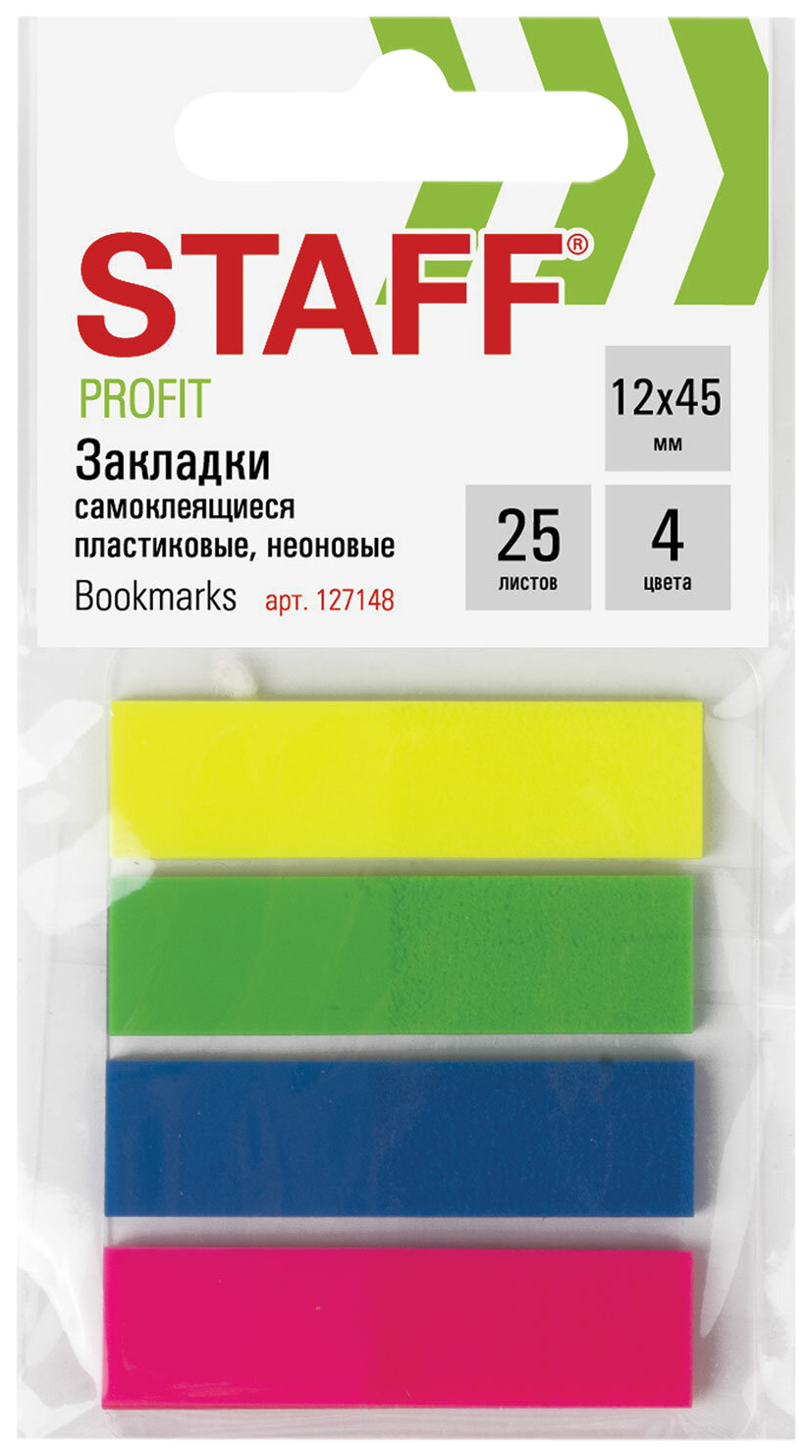 Закладки клейкие STAFF НЕОНОВЫЕ пластиковые 12х45мм 4 цвета х 25 листов 127148 100029583217