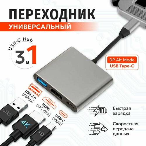 Переходник Type-C HUB USB3.0 - HDMI - Type-C (Серебристый)