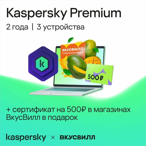 Антивирус Kaspersky Premium 3 устройства на 2 года + Сертификат во ВкусВилл на 500 рублей (код активации)