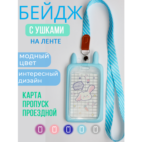 Бейдж с ушками Зайчик, Кролик в силиконовой оправе, для пропуска, чехол для карты, на ленте, для аниме-карточки, для школьной карты. Голубой.