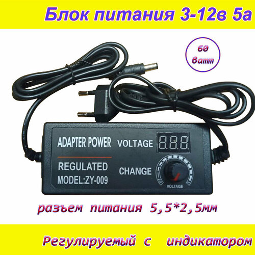 Блок питания регулируемый от 3вольт до 12вольт 5А ( 3-12V / 5A ) с индикатором напряжения, сетевой адаптер универсальный , штекер 5.5x2.5мм