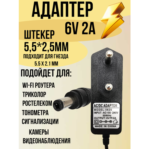 Блок питания сетевой адаптер 6V 2A 5,5*2,5мм универсальный Триколор, Ростелеком, тонометра, роутера, видеонаблюдения