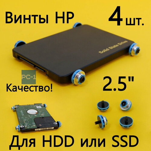 4шт. Винты HP для HDD SSD 2.5" голубые с черным. Антивибрационные с поглощающими прокладками. Без винтовое крепление дисков в корпуса ПК HP.