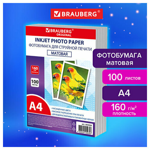 Фотобумага матовая, А4, 160 г/м2, односторонняя, 100 листов, пакет, BRAUBERG ORIGINAL 364428