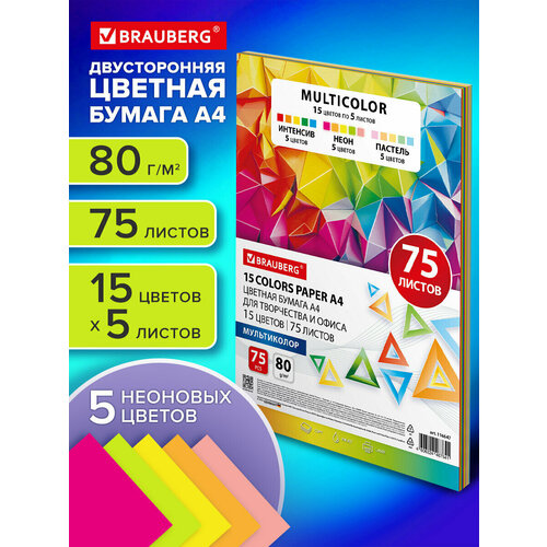 Цветная бумага для принтера, школы А4 набор 15 цветов 75 листов (15 цветов x 5 листов), двусторонняя для печати, оригами 80 г/м2, Brauberg Multicolor, 116647