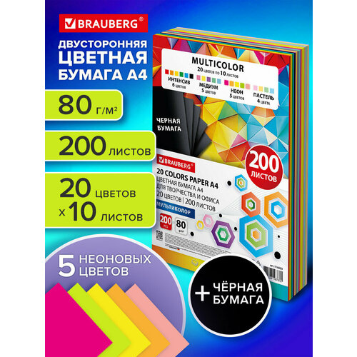 Цветная бумага А4 набор 20 цветов 200 листов, двусторонняя для печати, оригами 80 г/м2, Brauberg Multicolor, 116650