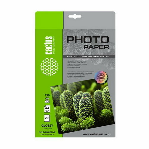 Фотобумага для струйной печати А4, 50 листов Cactus, 200 г/м2, односторонняя, глянцевая, в пакете