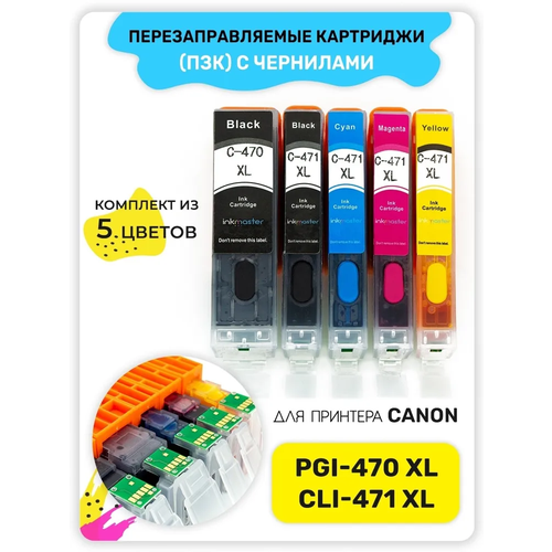 Перезаправляемые картриджи ПЗК PGI-470/CLI-471 XL для Canon PIXMA TS5040, MG5740, TS6040, MG6840, MG7740, TS8040, TS9040 с чипами 5 цветов (с чернилами), Inkmaster