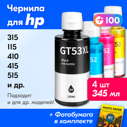 Чернила для HP GT52, GT53, на принтер HP Smart Tank 515, 500, 516, 530, 580, 581, 720, 520, 725, Ink Tank 415, 410, 315, 419, 115, 319, DeskJet GT5810, GT5820 и др,4шт Краска для заправки струйного принтера