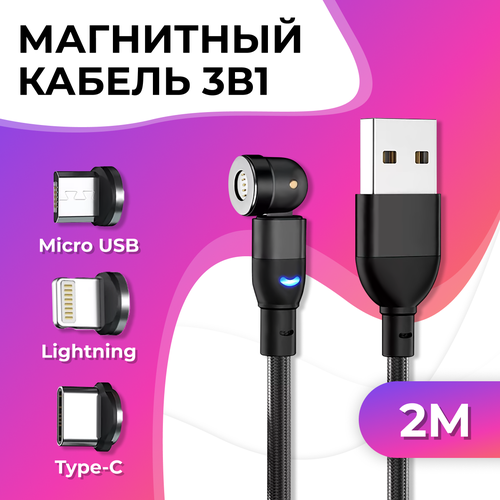 Магнитный кабель 3 в 1 Micro, Type-C, Lightning / Зарядка с тремя коннекторами Микро ЮСБ, Тайп-Си, Лайтинг / Зарядный шнур с магнитами 2 метра (Черный)