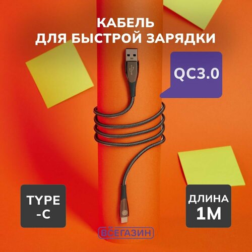 Кабель для зарядки Сириус Type-C всёгазин, 1м, 3А, Быстрая зарядка QC3.0, штекер металл