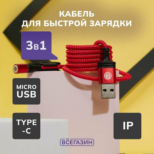 Кабель для зарядки Магнитный 3 в 1 всёгазин, iP/Micro USB/Type-C, 1м, 2.1А, прорезиненный
