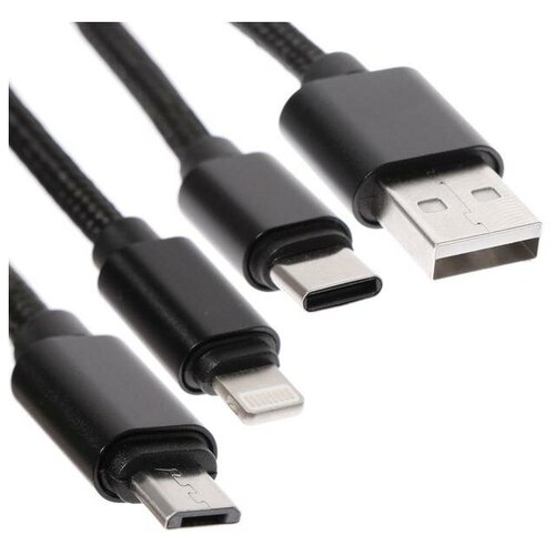 Кабель 3 в 1 LuazON, microUSB/Type-C/Lightning - USB, 2 А, 1 м, оплётка нейлон, черный