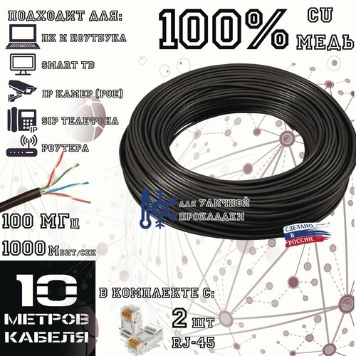 Внешний интернет кабель (витая пара) полимет, для прокладки на улице, CU (чистая медь), UTP4 пары, Cat.5е, outdoor, черный, 10 м.