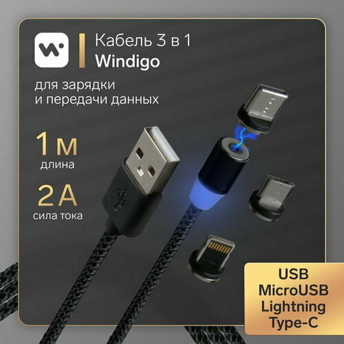 Кабель 3 в 1, microUSB/Lightning/Type-C - USB, магнитный, 2 А, нейлон, 1 м