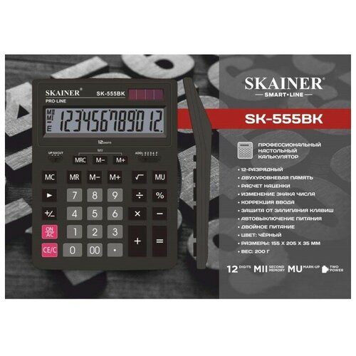 Калькулятор настольный большой, 12-разрядный, SKAINER SK-555BK, 2 питание, 2 память, 155 x 205 x 35 мм, черный (комплект из 2 шт)