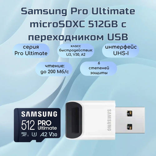 Карта памяти Samsung Pro Ultimate microSDXC 512GB Class 10, V30, A2, UHS-I U3, R 200 МБ/с, с переходником на USB