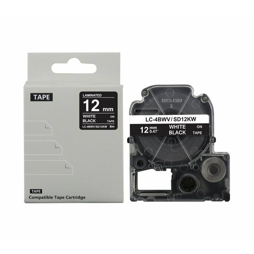 Картридж BYZ LC-4BWV / SD12KW с самоклеящейся термолентой для принтеров Epson, 12 мм, 8 м, белый текст на черной ленте