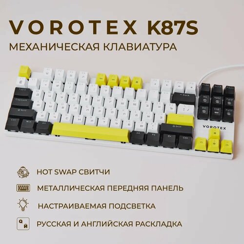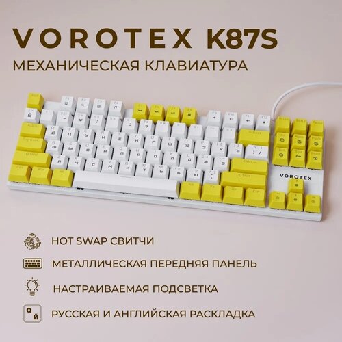 Игровая клавиатура VOROTEX K87S Blue Switch, белый/черный/жёлтый, русская