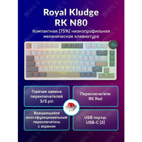 Беспроводная низкопрофильная механическая клавиатура Royal Kludge RK N80 (75%) цвет Pearly Dawn, Дисплей, RGB, Hot Swap, кейкапы с подсветкой символов EN, линейные свитчи (Low-Profile RK Red)