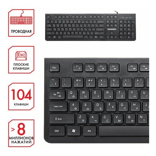 Клавиатура проводная SONNEN KB-8280 USB 104 плоские клавиши черная, 1 шт
