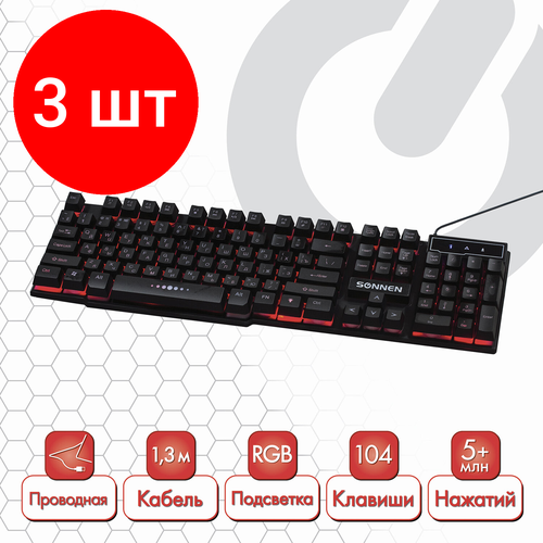 Комплект 3 шт, Клавиатура проводная SONNEN KB-7010, USB, 104 клавиши, LED-подсветка, черная, 512653