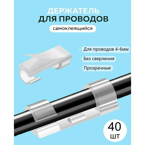 Держатели для проводов самоклеящиеся 4-6мм, прозрачные, 40 шт.