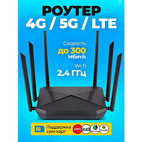 Wi-Fi роутер 4G, 5G, LTE со слотом для SIM-карты, 300 мб/c, Черный