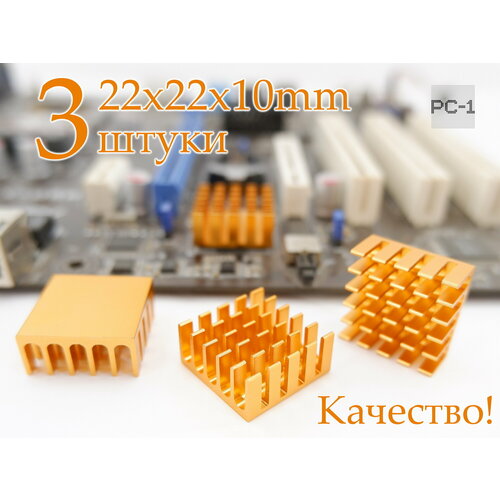 3шт. 22x22x10mm Gold Ребристый Алюминиевый радиатор для чипов, микросхем ПК и электроники, цвет медный. Качество, не Ржавеет