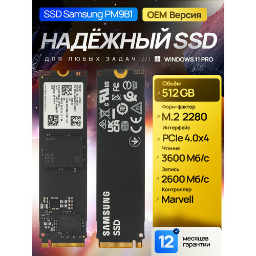 Накопитель SSD Samsung 512 ГБ M.2 PM9B1, PCIe Gen 4.0 x4, NVMe (чтение - 3600 Мб/с, запись - 2600 Мб/с), OEM
