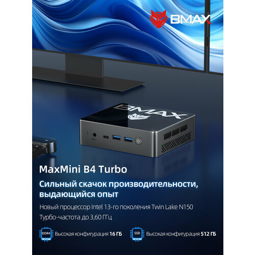 Мини ПК BMAX B4 TURBO, Intel N150, RAM 16ГБ, ROM 512 ГБ SSD, Intel UHD Graphics, Windows 11 Pro, Type-C, Чёрный