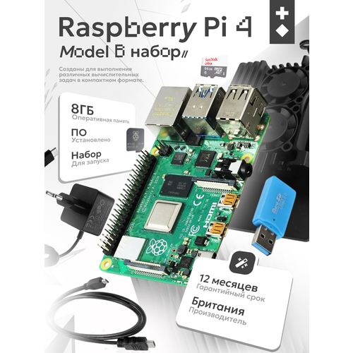 Набор-комплект Raspberry Pi 4 model B 8Gb + micro sd 64gb + блок питания от rpi + металлический корпус