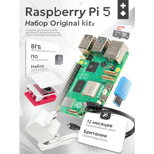 Набор-комплект Raspberry Pi 5 8Gb + micro sd 64gb + блок питания от rpi 27w + металлический корпус / микрокомпьютер расберри