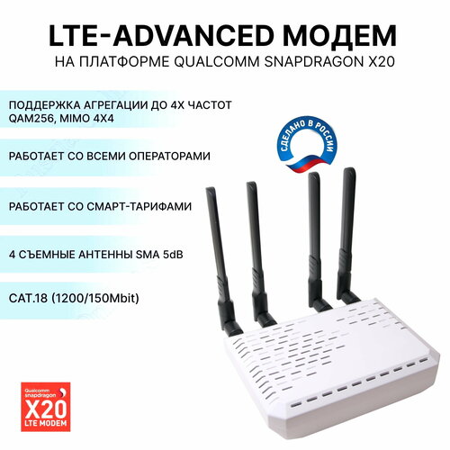 белыйLTE Advanced Модем в корпусе 140х100х35мм (без учета антенн) на платформе Qualcomm Snapdragon X55 5G (Категория 22, до 2000 Мбит\с на загрузку и до 200 Мбит\с на отдачу).