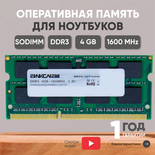 Модуль памяти Ankowall SODIMM DDR3, 4ГБ, 1600МГц, 1.5В, 204PIN, PC3-12800, CL11 11-11-11-28
