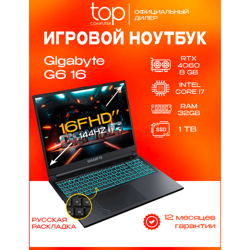 Ноутбук Gigabyte G6 16" FHD 1920х1080 /Core i7 13620H/32GB/SSD 1Tb/NVIDIA GF RTX4060 8Gb/без OS/black