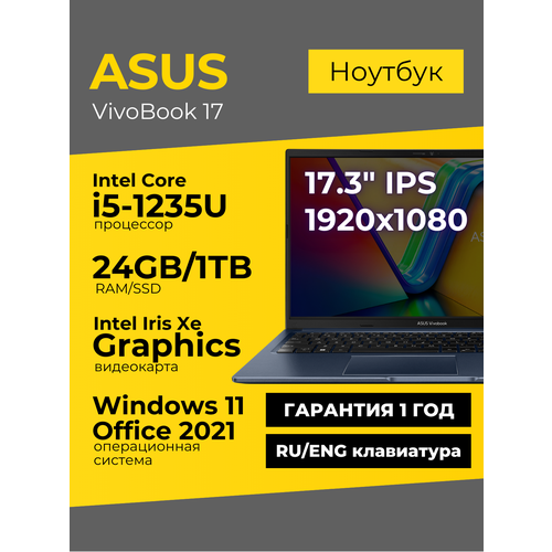 Ноутбук Asus Vivobook 17 17.3 IPS 1920x1080 Intel Core i5-1235U 24ГБ 1ТБ Intel Iris Xe Синий Windows 11+Office 2021