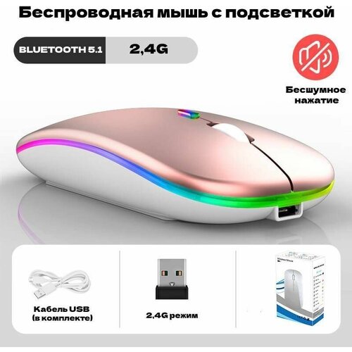 Мышь компьютерная беспроводная с подсветкой, 2 вида подключения bluetooth 5.1 + 2,4G, бесшумная, розовая